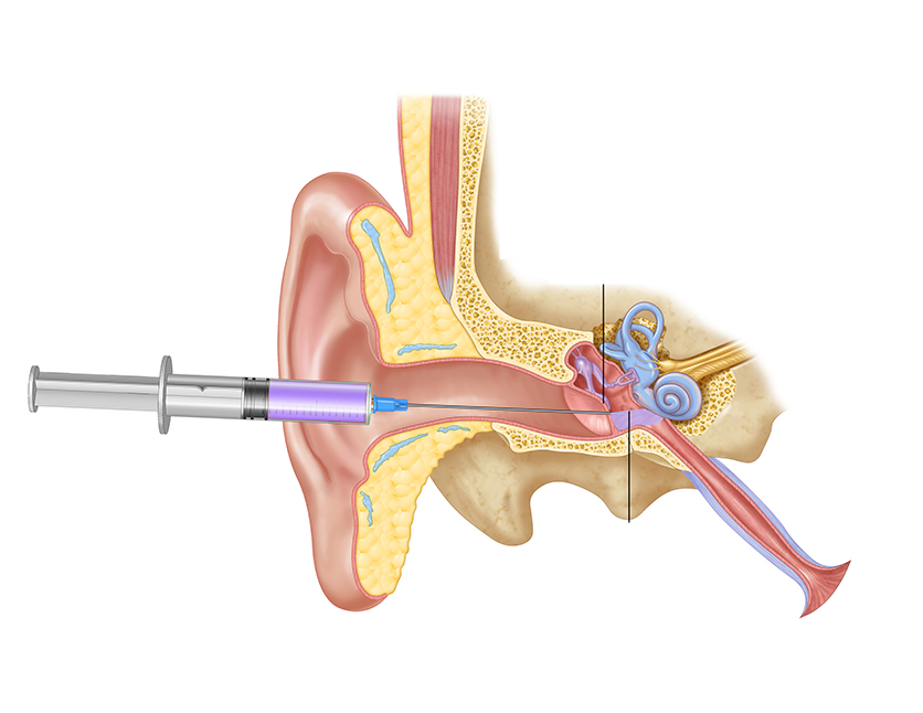 Podanie leku bezpośrednio do ucha środkowego ma kluczową przewagę nad lekami przyjmowanymi w tabletkach. Glikokortykosteroidy podane drogą iniekcji przenikają przez tzw. błonę okienka okrągłego bezpośrednio do ucha wewnętrznego (ślimaka).